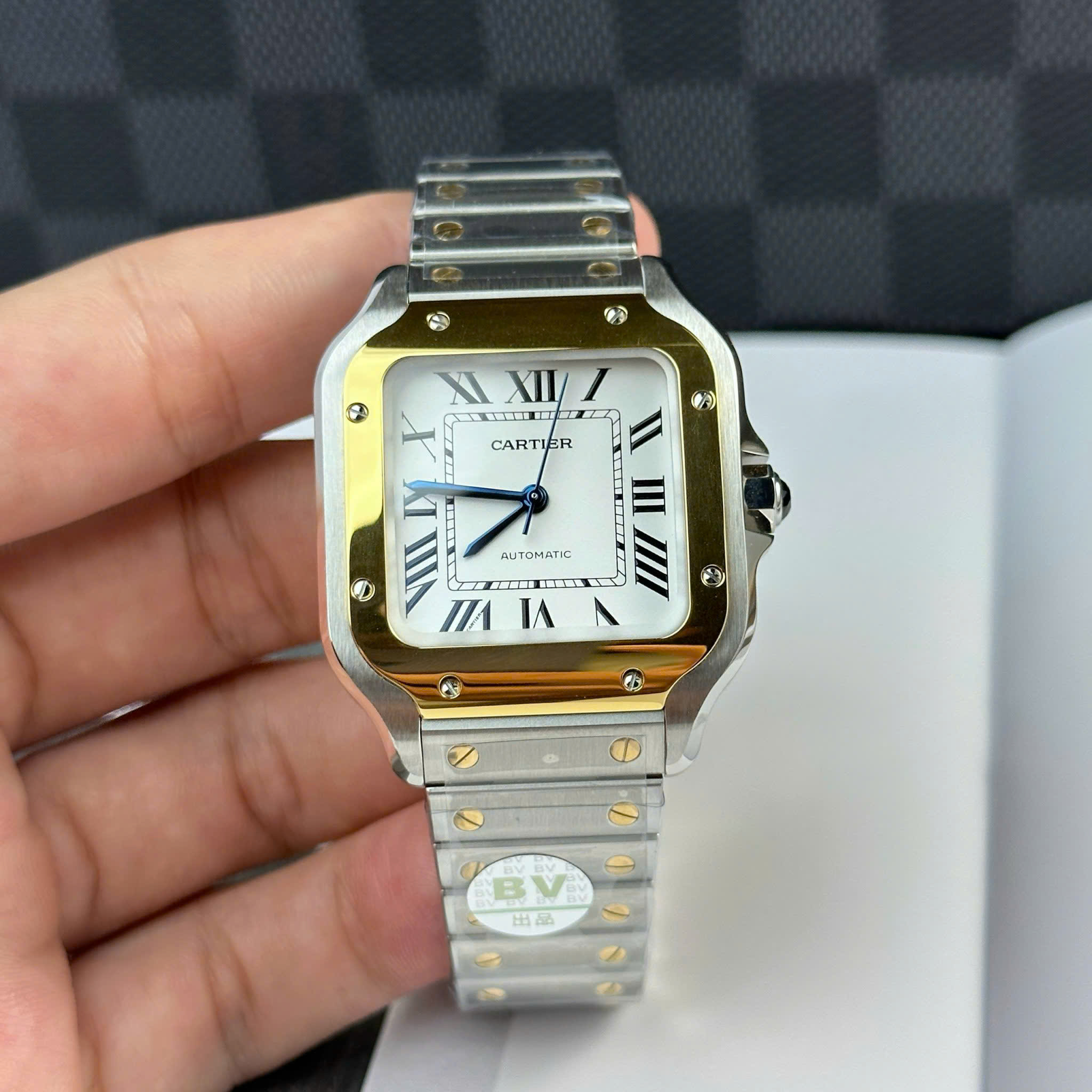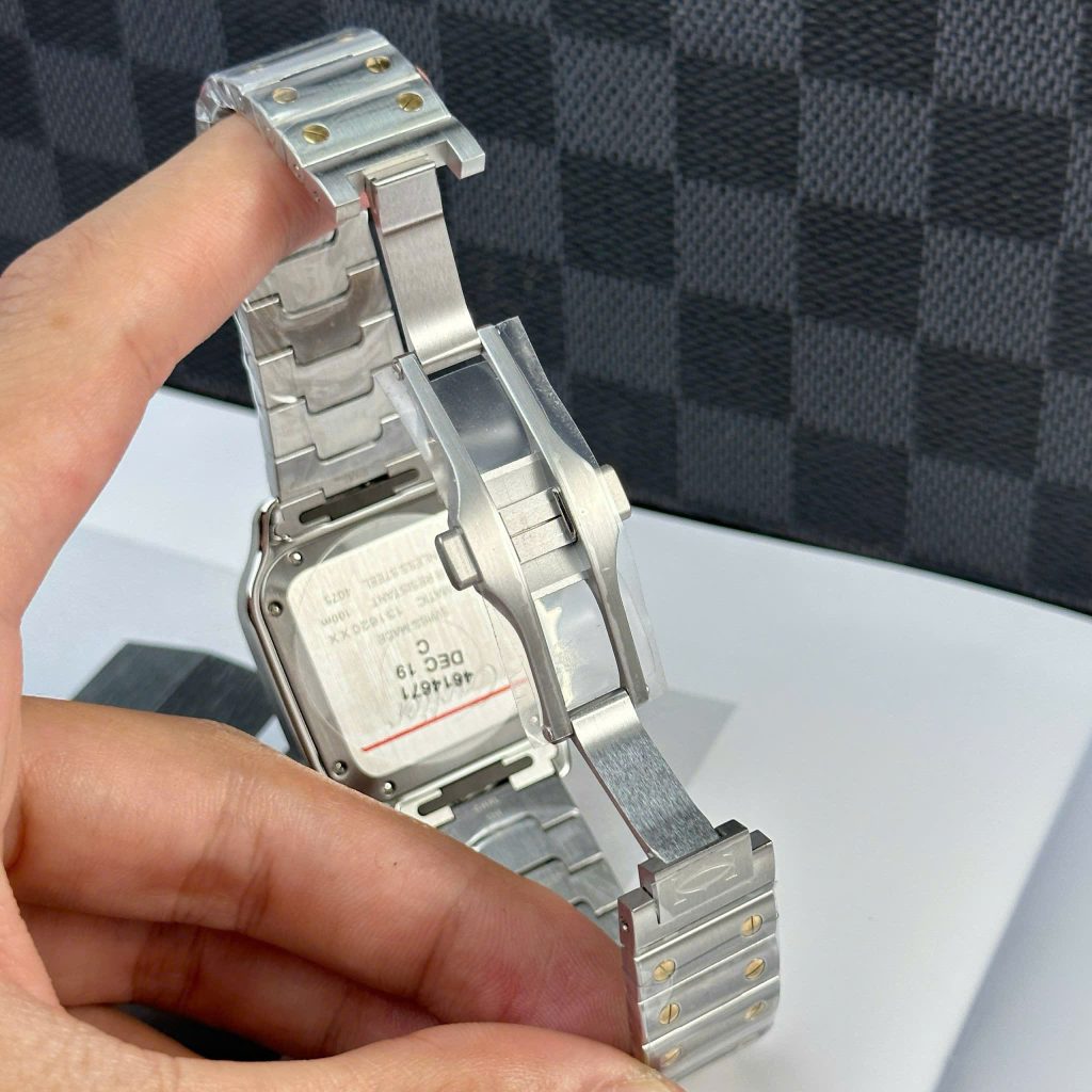 ĐỒNG HỒ CARTIER SANTOS REPLICA CAO CẤP MẶT SỐ MÀU TRẮNG VIỀN ĐÍNH KIM CƯƠNG MOISSANITE NHÀ MÁY BV 39.8MM