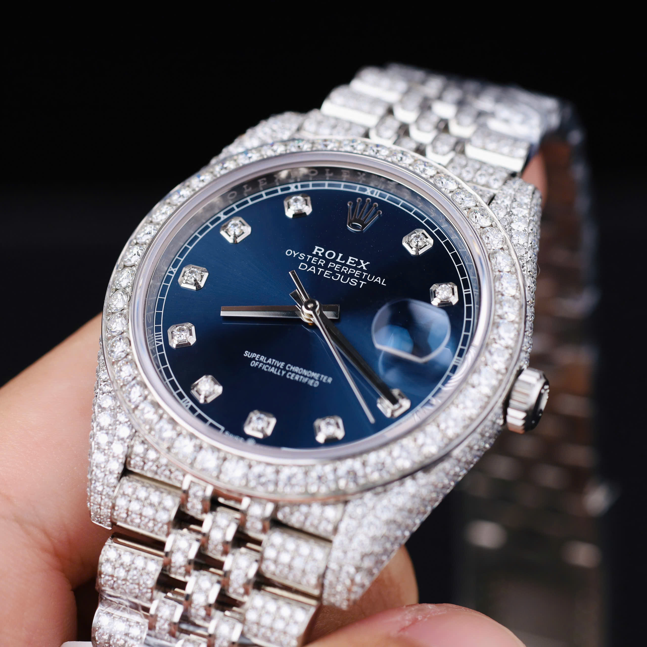 ROLEX DATEJUST GOOD IMITATION WATCH BLUE DIAL ICED OUT DIAMOND MOISSANITE CLEAN FACTORY 41MM